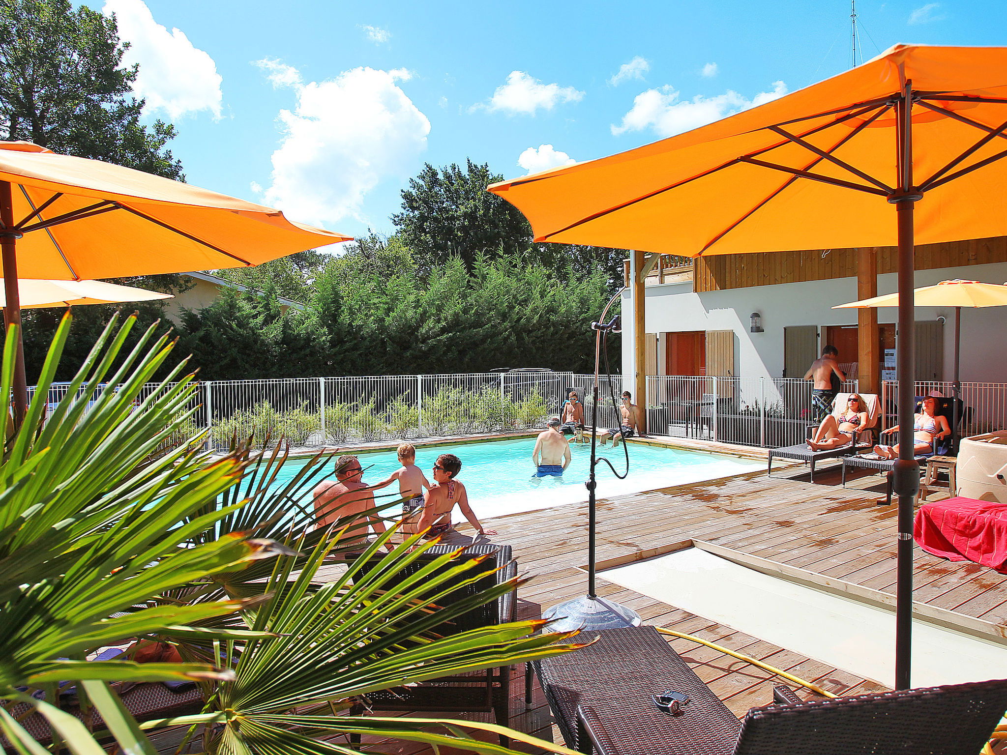 Resort "Les Rives du Lac". 11 houses in the residence. 37 apartments in the residence. 6 km from the centre of Lacanau, 6 km from the centre of Lacanau-Océan, 55 km from the centre of Bordeaux, 7 km from the sea, 150 m from the lake. For shared use: property with plants and trees, swimming pool heated (9 x 6 m, depth 120 cm, seasonal availability: 01.May. - 24.Sep.). Boccia, terrace. In the complex: reception, WiFi, sauna, steam room, washing machine (extra), tumble dryer (for shared use, extra). Parking (limited number of spaces). Supermarket 6 km, restaurant 200 m, sandy beach "Lac de Lacanau/Plage Le Moutchic" 400 m. Golf course (18 hole) 4 km, riding stable 4 km. Please note: the photograph shows a typical example. The holiday properties may differ in living space, floorplan, equipment and furnishing. Access to the sauna, steam bath permitted from age 18 only.