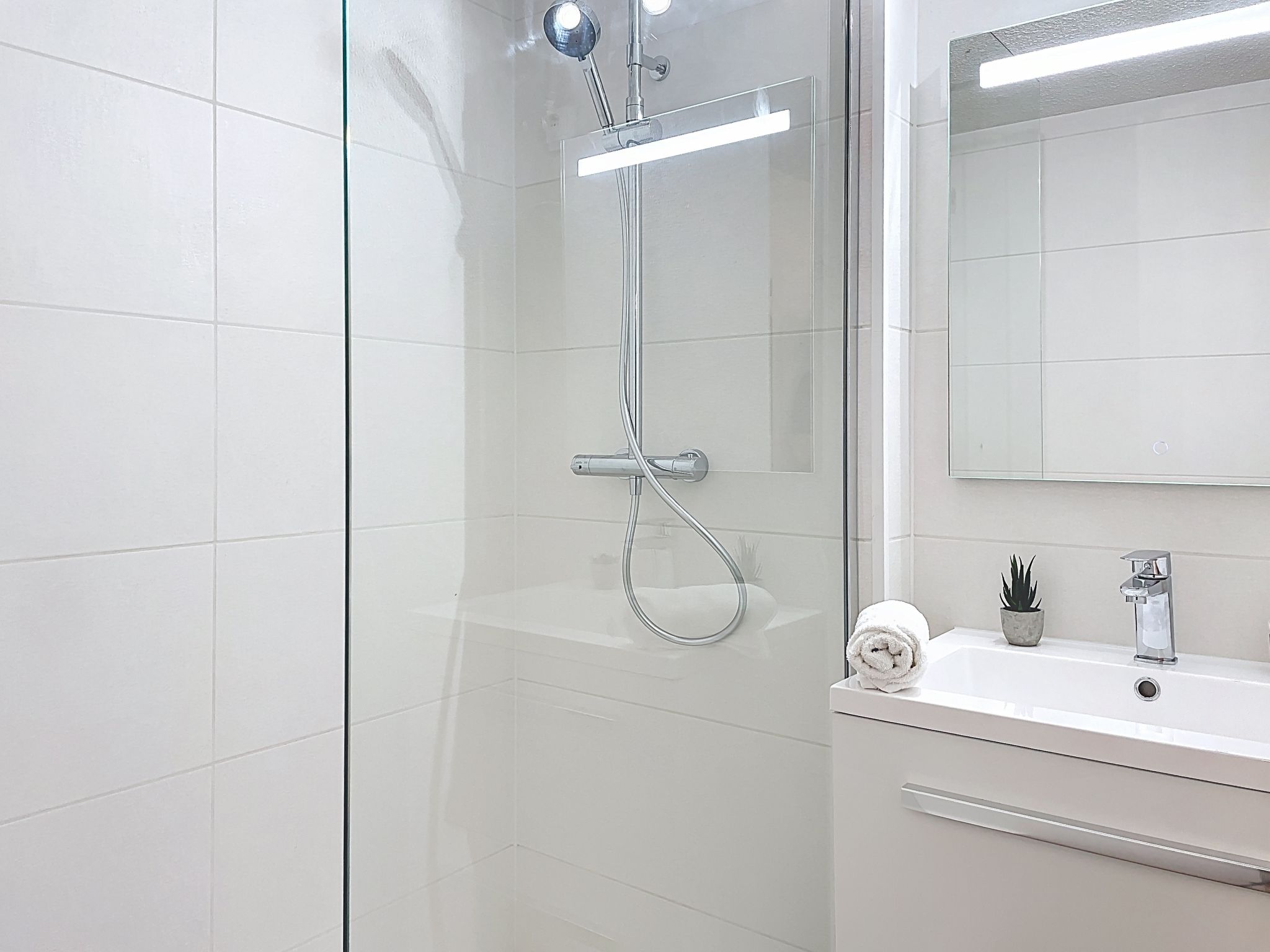 3-room penthouse 38 m2 on 2 levels on 2nd floor, north-west facing position. Comfortable furnishings: living/dining room with TV. Exit to the balcony. 1 room with 1 french bed (140 cm, length 190 cm). Kitchenette (oven, dishwasher, 2 induction hot plates, kettle, microwave, electric coffee machine, Capsules for coffee machine (Nespresso) extra). Shower/WC. Heating. Upper floor: (steep stair) with sloping ceilings, 1 open room, ceiling height 180 - 220 cm with 1 french bed (180 cm, length 190 cm). Balcony 8 m2, north facing position and west facing position. Balcony furniture. View of the sea. Facilities: washing machine, iron, hair dryer. Internet (WiFi, free). Please note: non-smokers only. Smoke alarm.