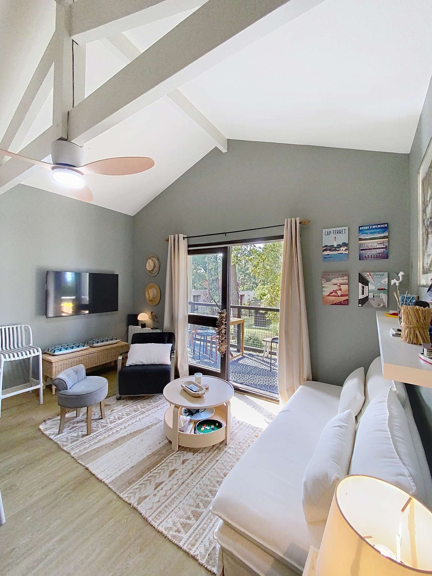 It features a living room opening onto a balcony with a bay window overlooking the putting greens, as well as a fully equipped open kitchen.