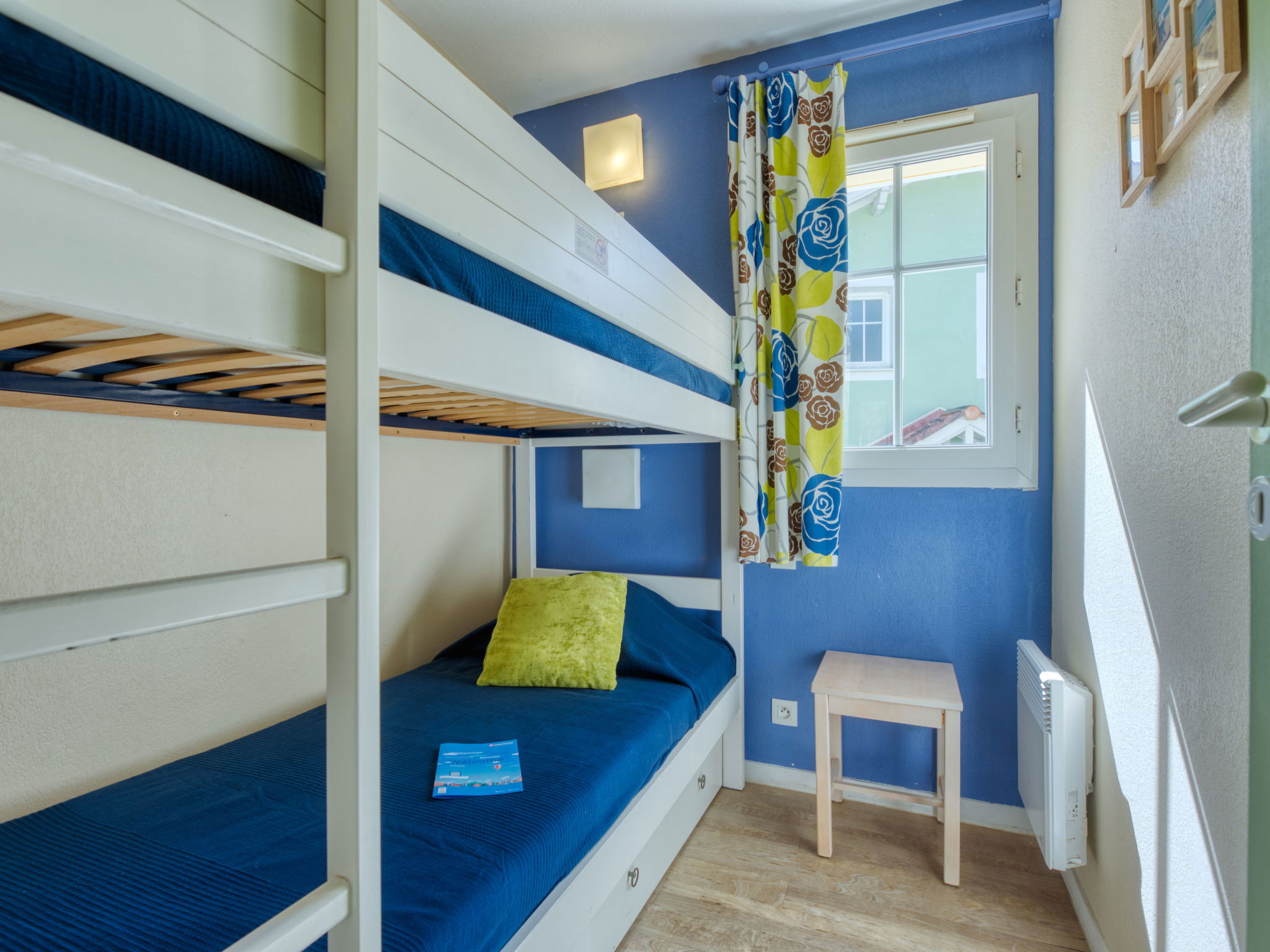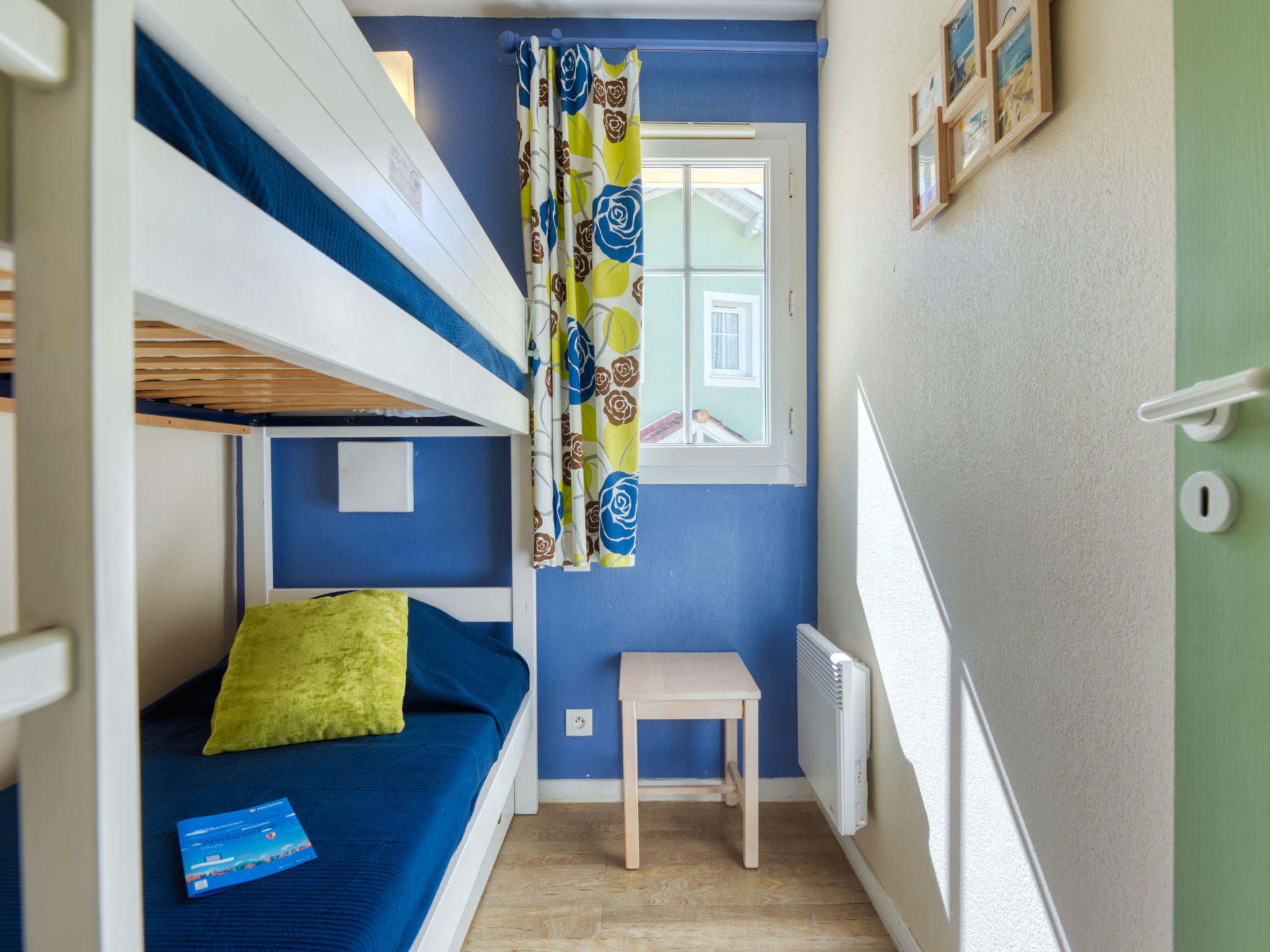 4-room terraced house 62 m2 on 2 levels. Comfortable furnishings: living/dining room with TV. Exit to the terrace. Kitchenette (dishwasher, 4 ceramic glass hob hotplates, electric coffee machine, Capsules for coffee machine (Nespresso), combination microwave). Bath/shower/WC. Electric heating. Upper floor: 1 room with 1 french bed (140 cm, length 190 cm), TV (flat screen). Exit to the balcony. 1 room with 2 beds (90 cm, length 190 cm). 1 small room with 1 x 2 bunk beds (90 cm, length 190 cm). Bathroom, sep. WC. Terrace, east facing position, patio. Terrace furniture. View of golf course. Facilities: Internet (WiFi, free). Parking. Please note: non-smokers only. Smoke alarm. -
