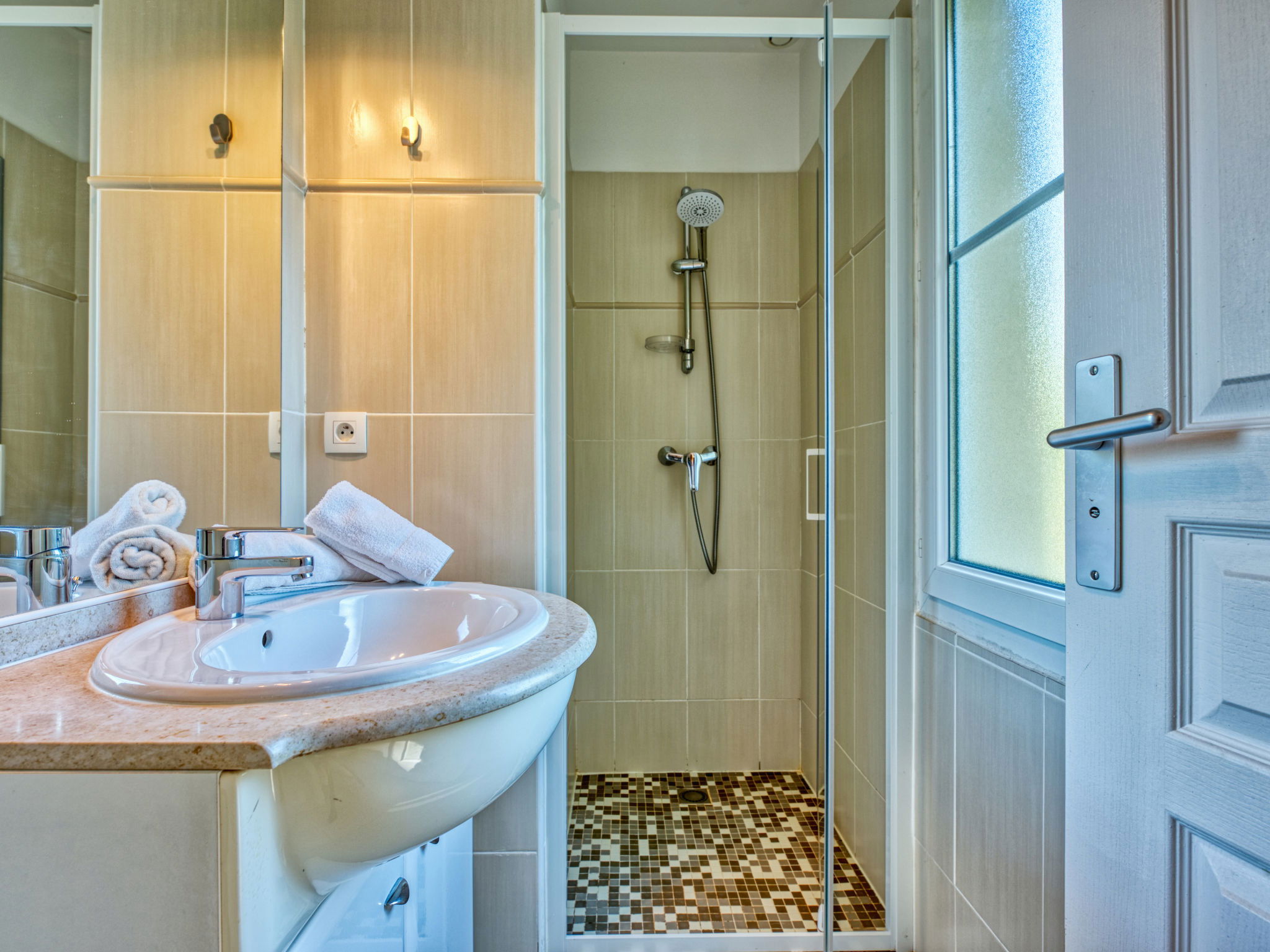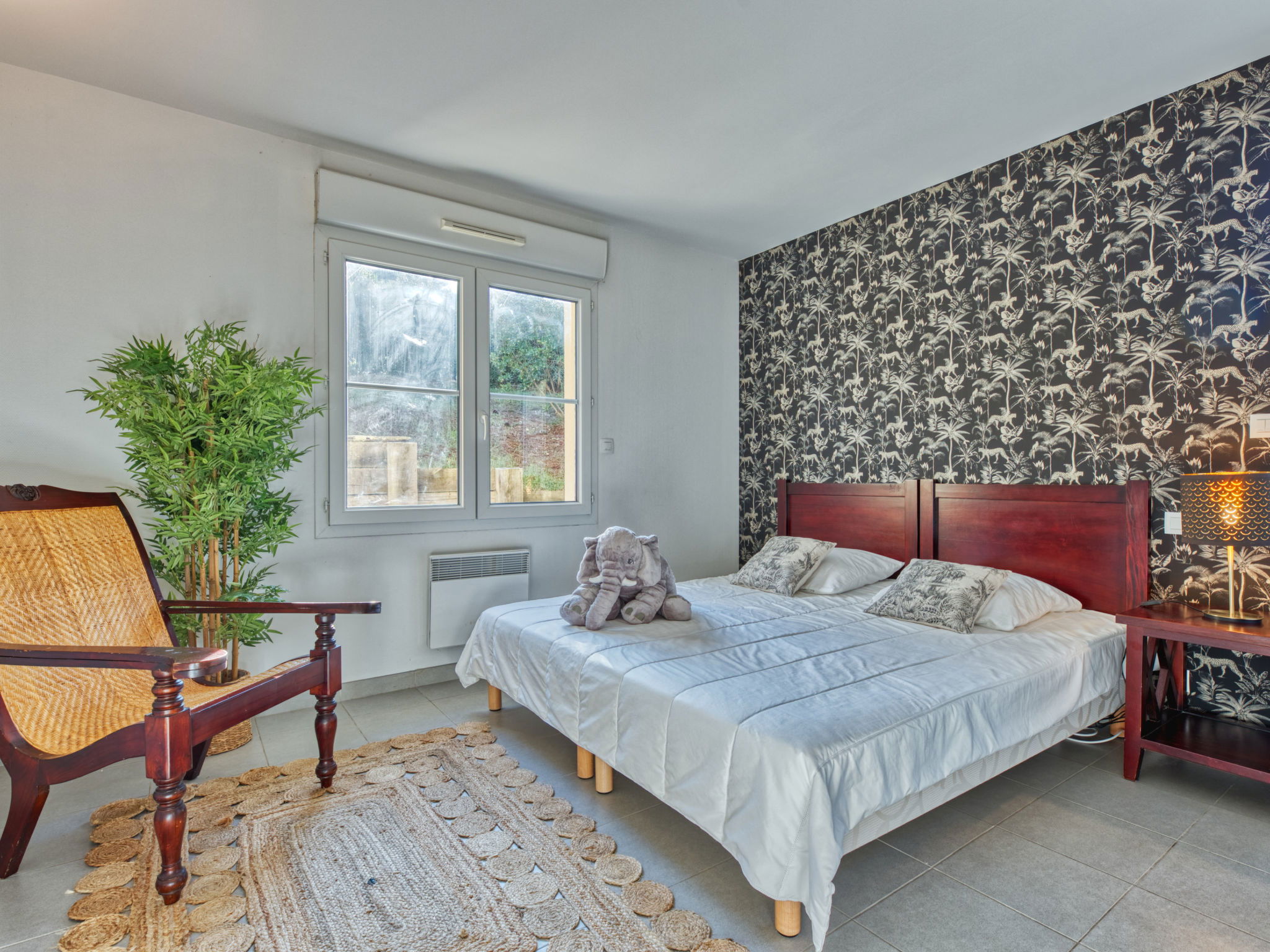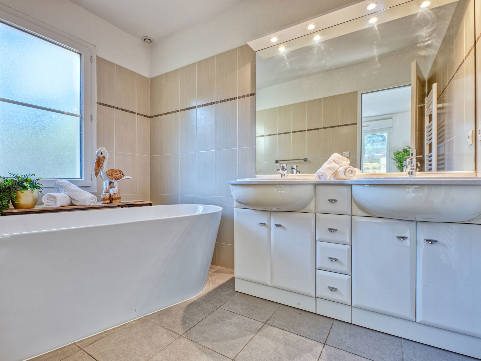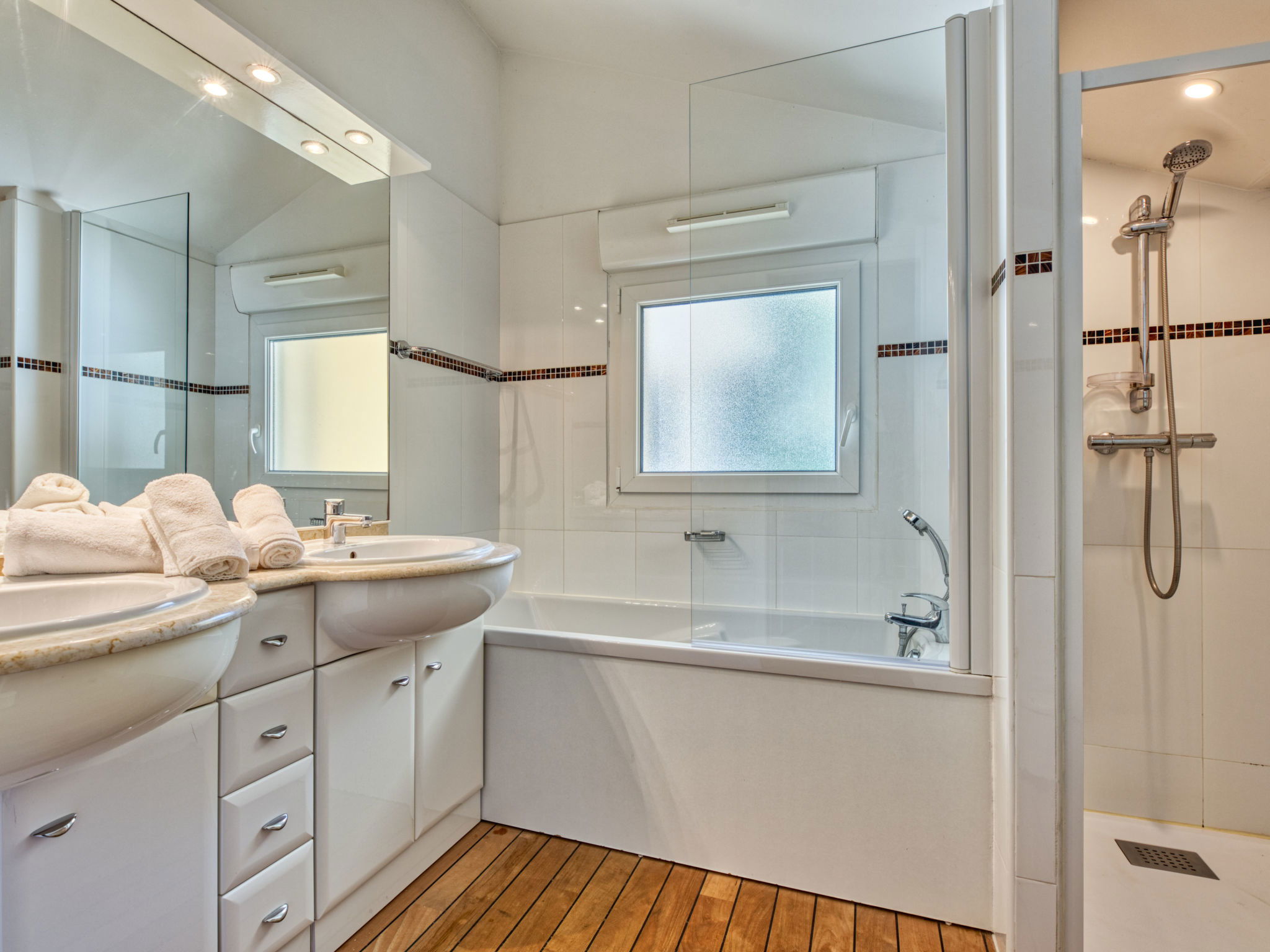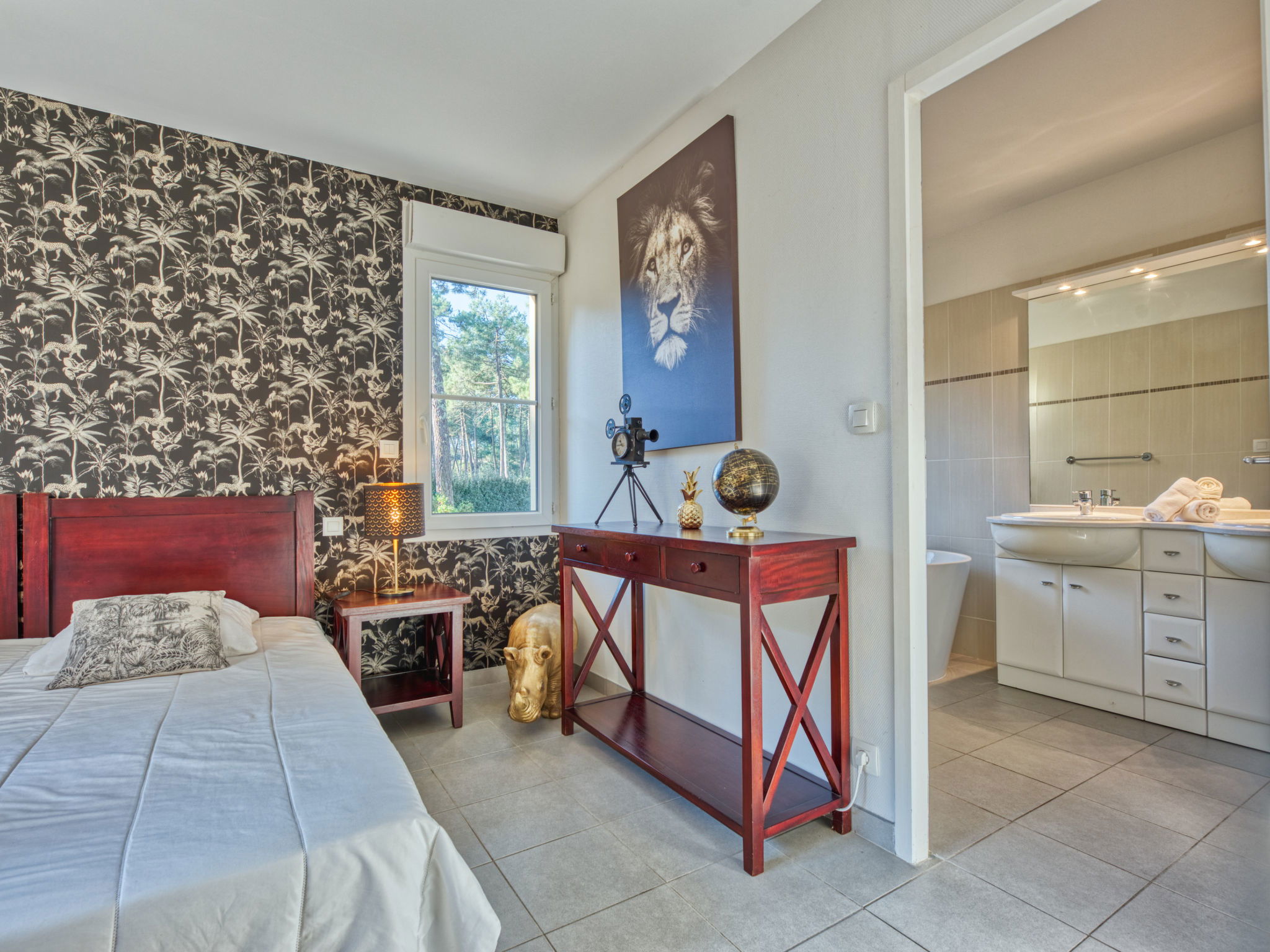 6-room villa 228 m2. Modern furnishings: large living/dining room with open-hearth fireplace and flat screen. 1 room with 1 french bed (180 cm, length 200 cm), bathroom and separate WC. 2 rooms, each room with 1 double bed (2 x 90 cm, length 200 cm), separate WC and shower. Large, open kitchen (oven, dishwasher, 4 induction hot plates, toaster, kettle, microwave, electric coffee machine, Capsules for coffee machine (Tassimo et senseo) extra) with TV. Exit to the garden, to the terrace. Upper floor: 1 room with 1 double bed (160 cm, length 200 cm), separate WC, bath/shower and TV. Exit to the balcony. 1 room with 1 french bed (2 x 90 cm, length 200 cm), bath/shower/WC. Large terrace, west facing position. Terrace furniture, deck chairs (6). Beautiful view of the swimming pool, the garden and the forest. Facilities: washing machine. Internet (WiFi, free). Parking (roofed). Please note: non-smoking house. Smoke alarm.