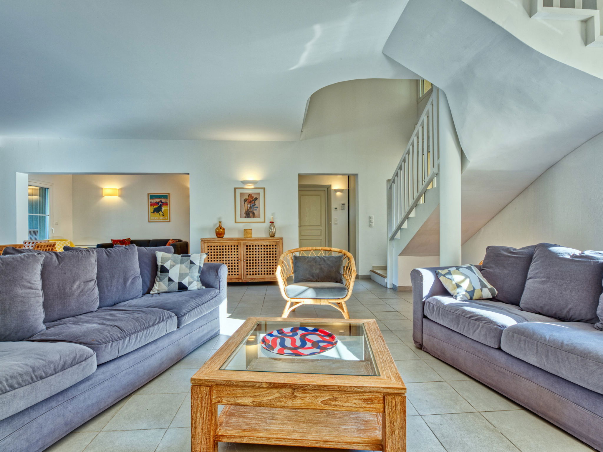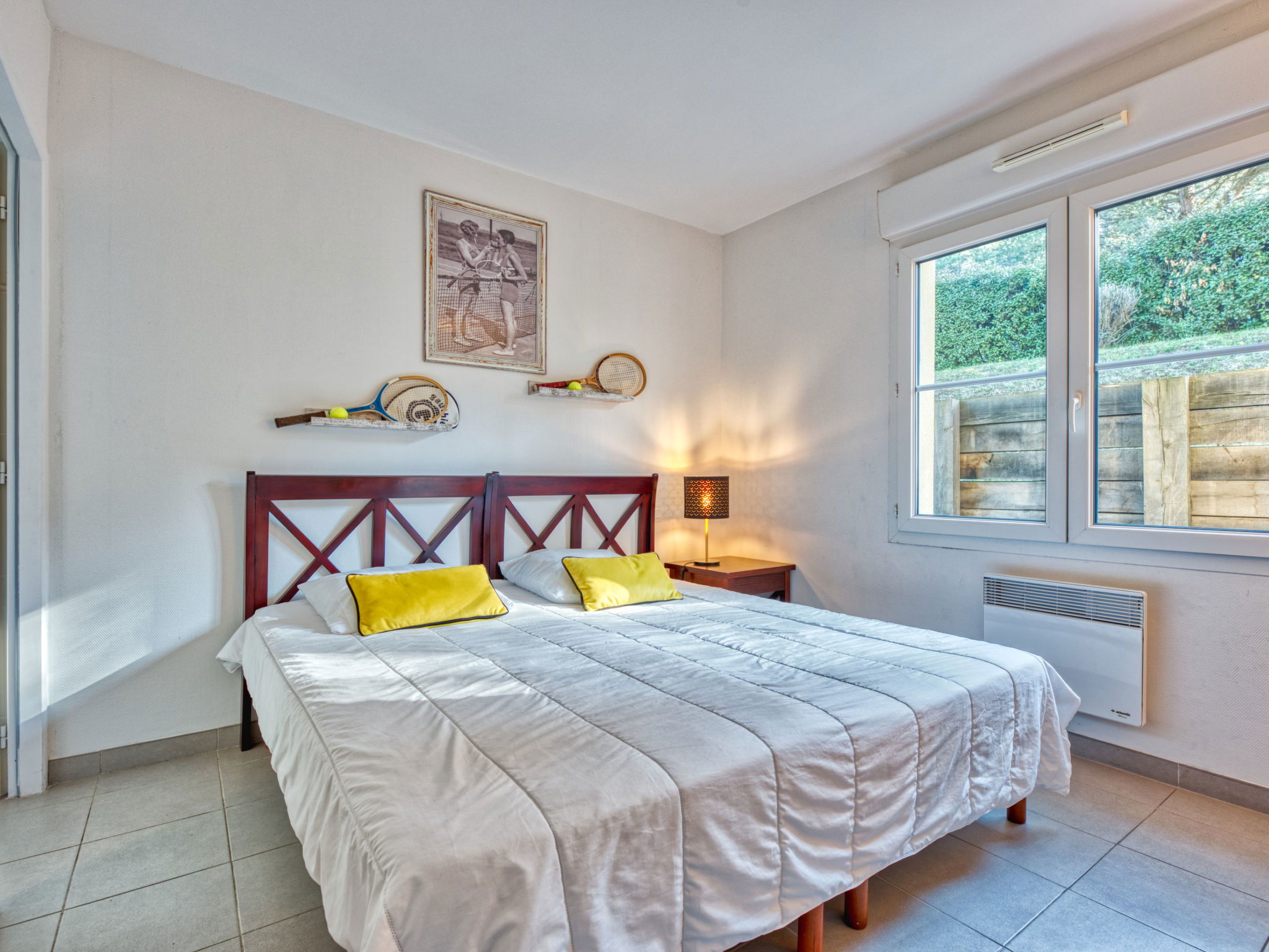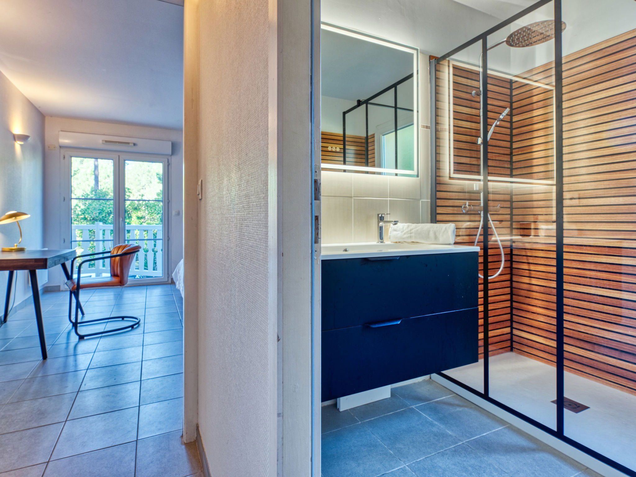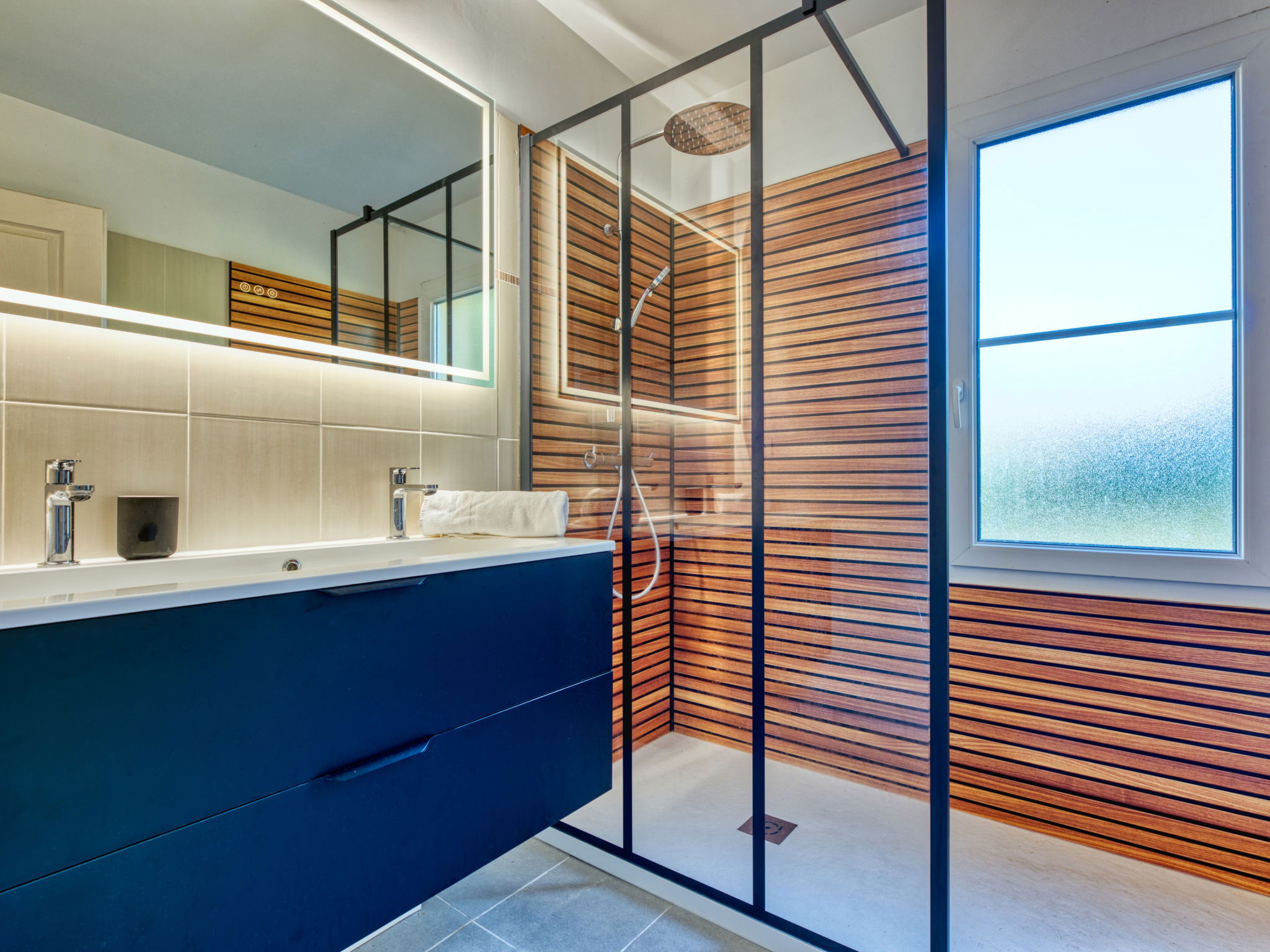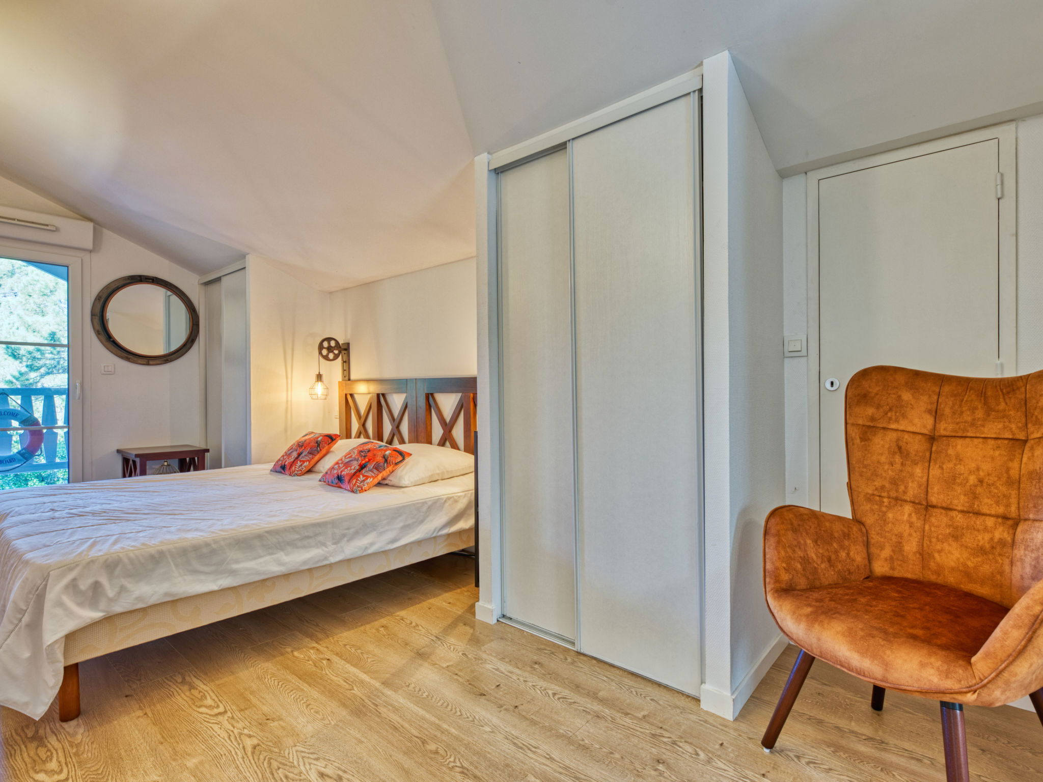 6-room villa 228 m2. Modern furnishings: large living/dining room with open-hearth fireplace and flat screen. 1 room with 1 french bed (180 cm, length 200 cm), bathroom and separate WC. 2 rooms, each room with 1 double bed (2 x 90 cm, length 200 cm), separate WC and shower. Large, open kitchen (oven, dishwasher, 4 induction hot plates, toaster, kettle, microwave, electric coffee machine, Capsules for coffee machine (Tassimo et senseo) extra) with TV. Exit to the garden, to the terrace. Upper floor: 1 room with 1 double bed (160 cm, length 200 cm), separate WC, bath/shower and TV. Exit to the balcony. 1 room with 1 french bed (2 x 90 cm, length 200 cm), bath/shower/WC. Large terrace, west facing position. Terrace furniture, deck chairs (6). Beautiful view of the swimming pool, the garden and the forest. Facilities: washing machine. Internet (WiFi, free). Parking (roofed). Please note: non-smoking house. Smoke alarm.