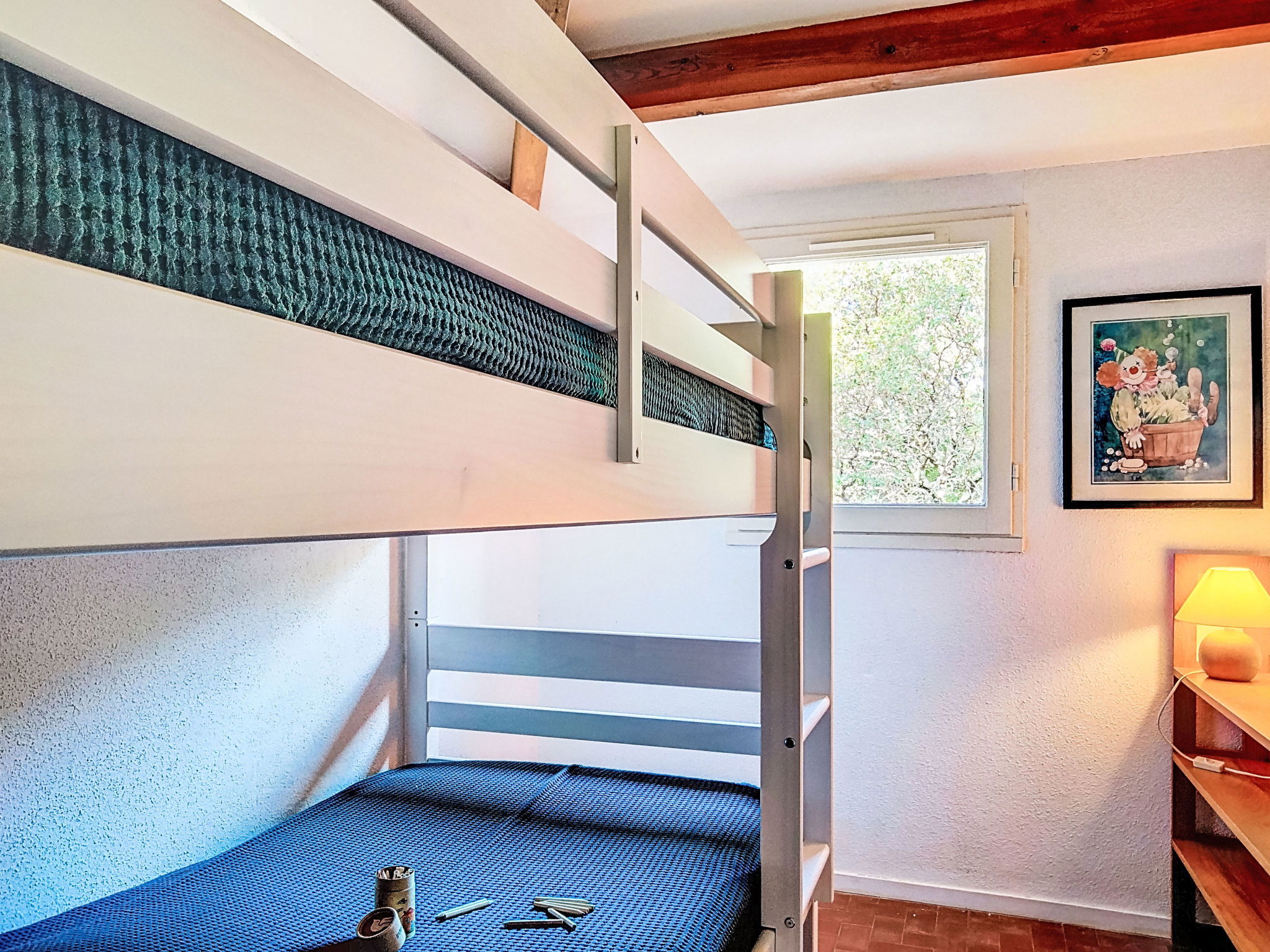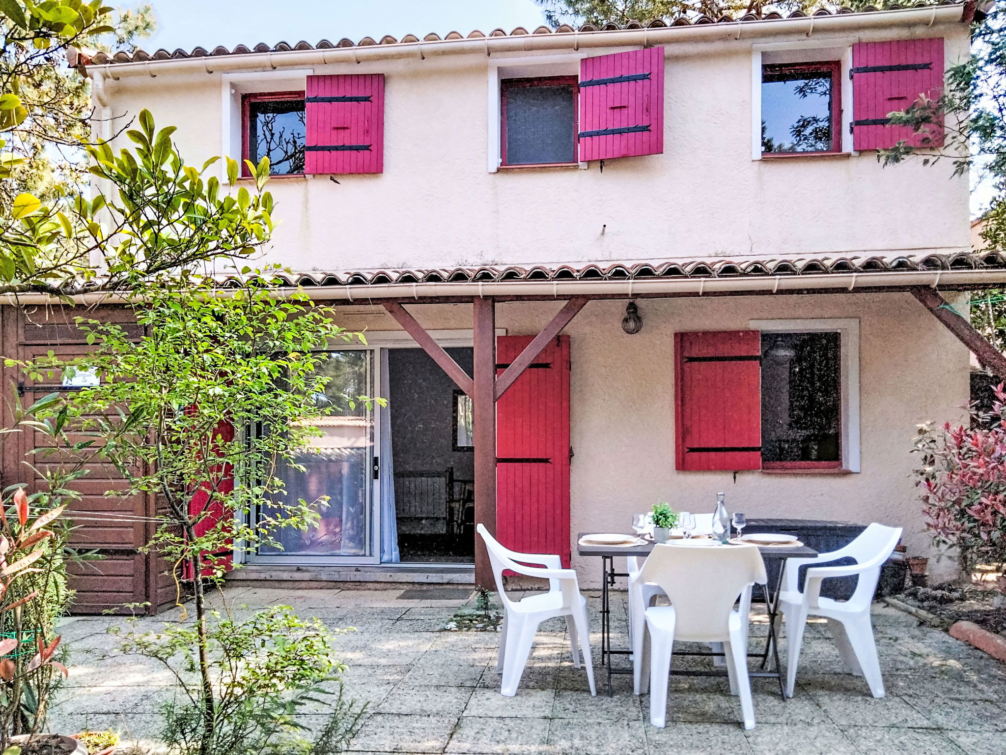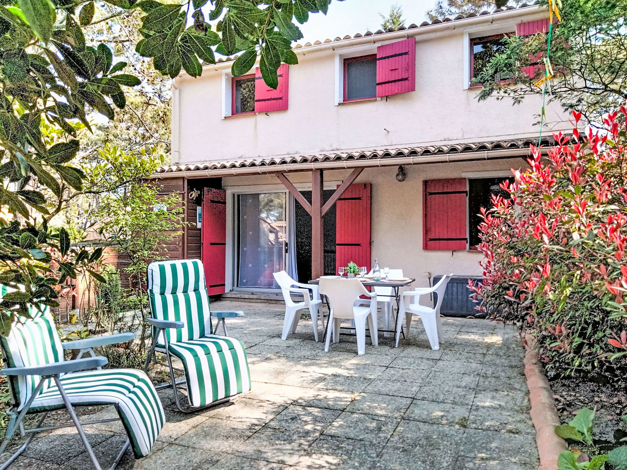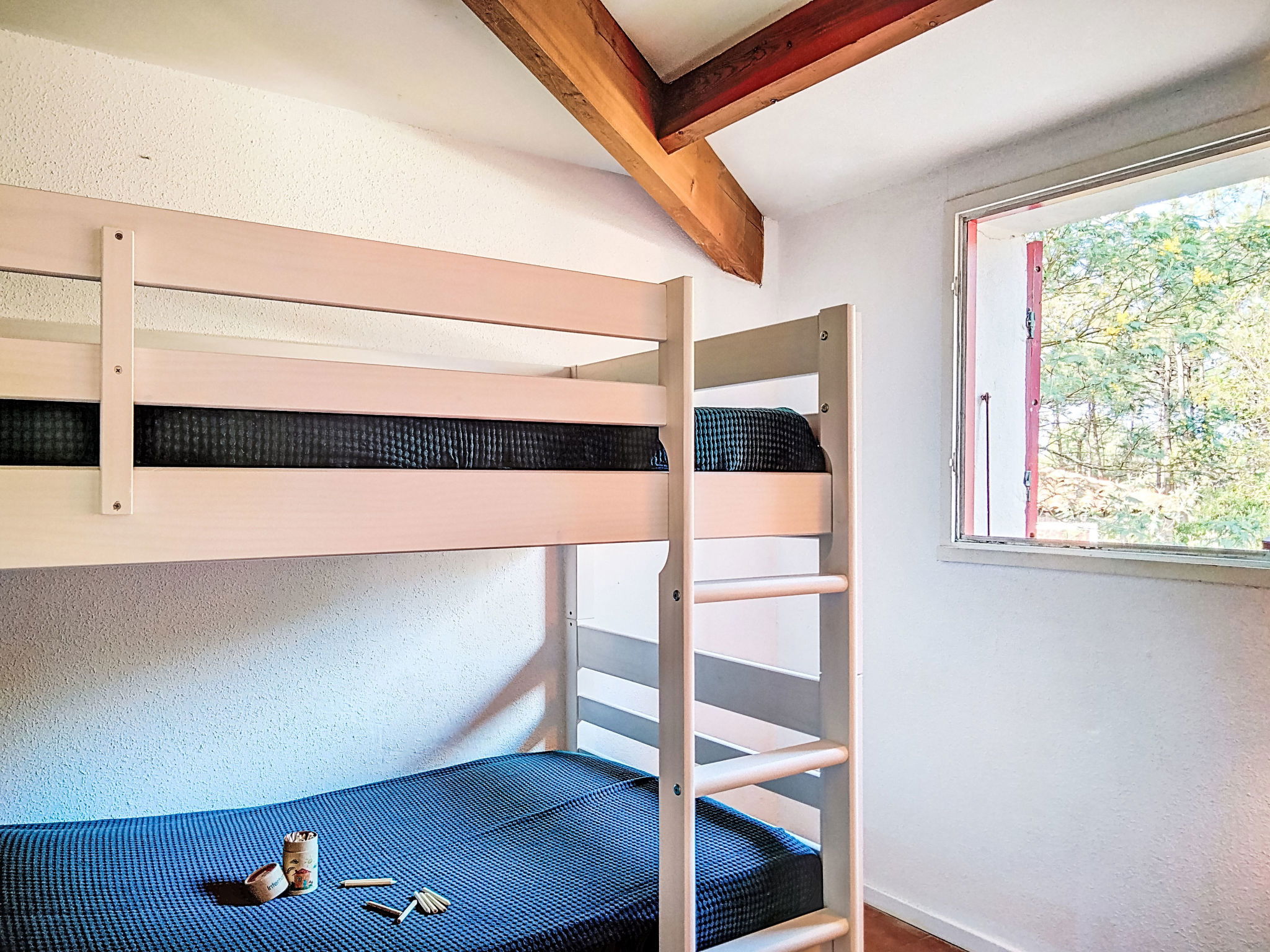 3-room semi-detached house 44 m2. Living/dining room with 1 double sofabed (1 x 140 cm, length 200 cm), TV (flat screen). Exit to the garden, to the terrace. Kitchen-/living room 6 m2 (2 hot plates, mini-oven, dishwasher, microwave, electric coffee machine) with dining table. Upper floor: 1 room with 1 double bed (1 x 140 cm, length 200 cm). 1 room with 1 x 2 bunk beds (90 cm, length 190 cm). Bath/WC. Electric heating. Terrace 20 m2, west facing position, patio 15 m2, west facing position. Terrace furniture. Partial view of the forest. Facilities: washing machine, hair dryer. Internet (WiFi, extra). Parking space n 99 (1 car) at 50 m. Please note: smoke alarm. Offer by a private individual according to Art. 155, IV of CGI.