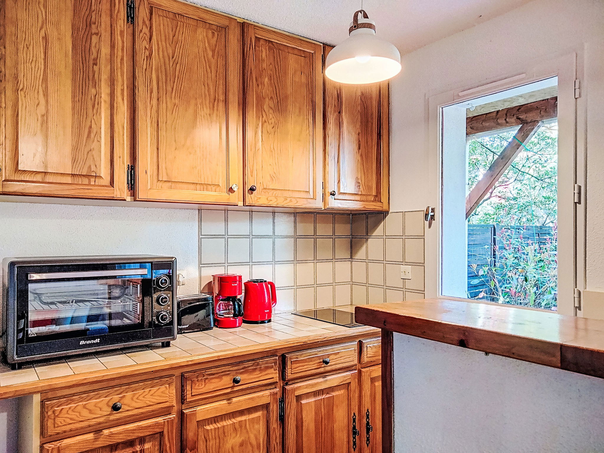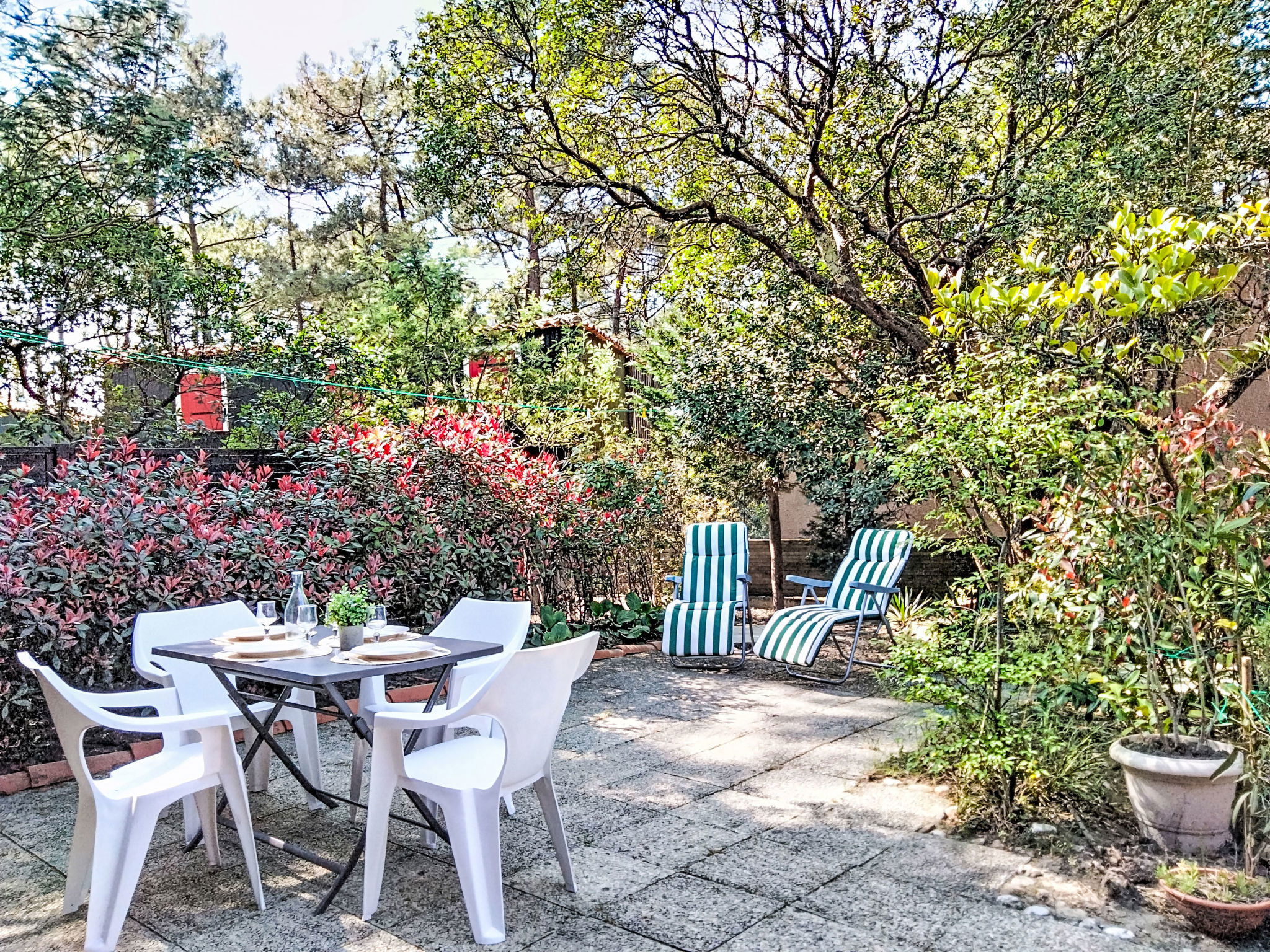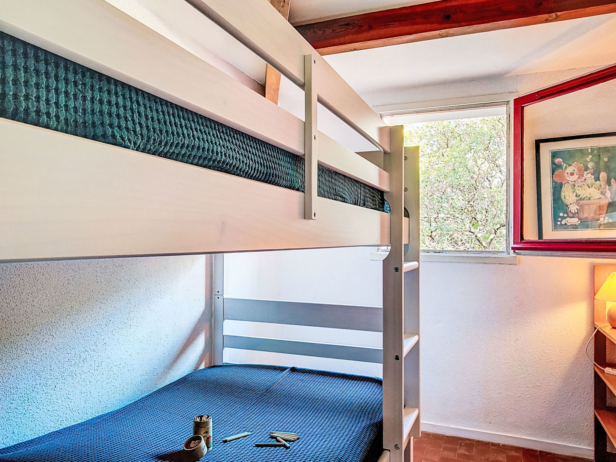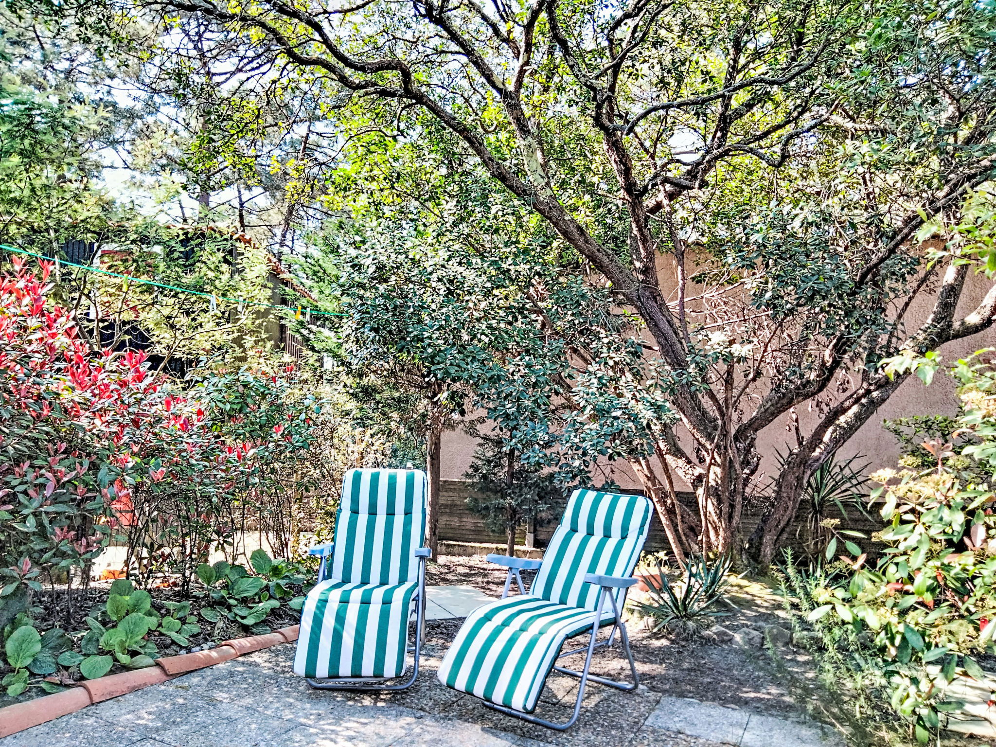 3-room semi-detached house 44 m2. Living/dining room with 1 double sofabed (1 x 140 cm, length 200 cm), TV (flat screen). Exit to the garden, to the terrace. Kitchen-/living room 6 m2 (2 hot plates, mini-oven, dishwasher, microwave, electric coffee machine) with dining table. Upper floor: 1 room with 1 double bed (1 x 140 cm, length 200 cm). 1 room with 1 x 2 bunk beds (90 cm, length 190 cm). Bath/WC. Electric heating. Terrace 20 m2, west facing position, patio 15 m2, west facing position. Terrace furniture. Partial view of the forest. Facilities: washing machine, hair dryer. Internet (WiFi, extra). Parking space n 99 (1 car) at 50 m. Please note: smoke alarm. Offer by a private individual according to Art. 155, IV of CGI.